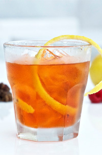 Place all ingredients in a glass. Add ice and stir for 30 seconds. Strain into a chilled cocktail glass. Garnish with a lemon twist/zest.