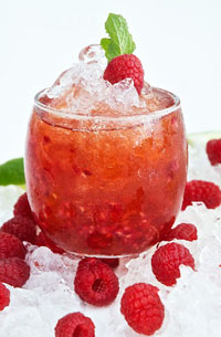 Crush the fresh raspberries in a cocktail shaker, then add the remaining ingredients, except the soda. Fill with cubed ice and shake hard. Strain into tall glass over fresh cubed ice and top up with soda. Garnish with a fresh raspberry.